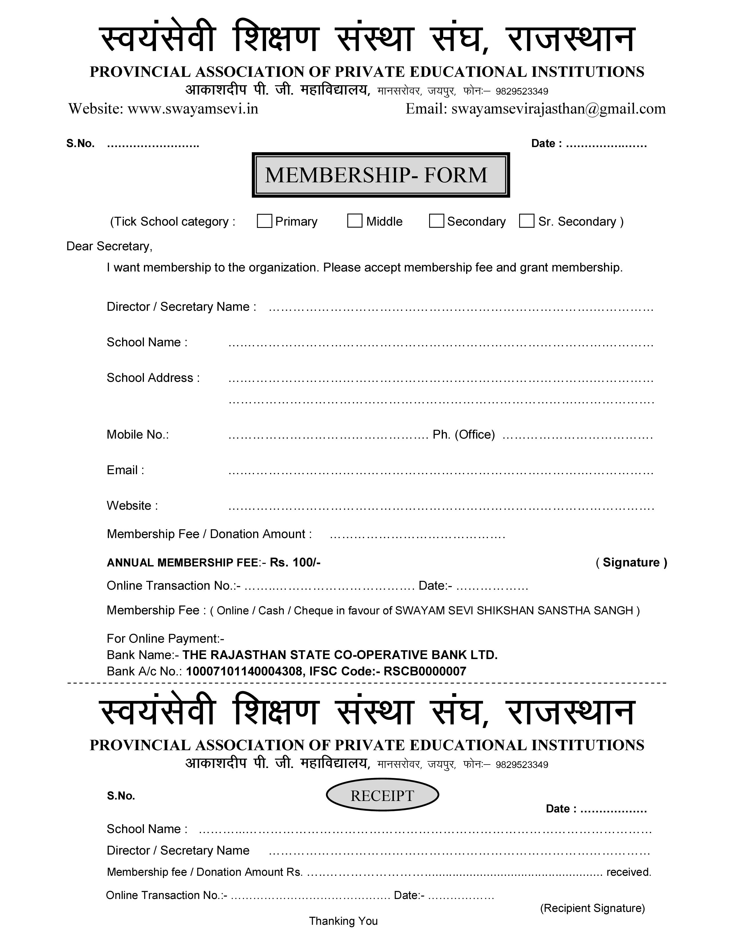 The role of non-Govt educational institutions in the promotion of educational values has been of paramount importance. But, these institutions have not been given their descried rights by the Govt. In order to safeguard their existence the non Govt educational institutions had to evolve a self-defence mechanism by which they could fight against the unjust and unfair policies of the Govt that might jeopardize the interests of these institutions. As such, Swayamsevi Shikshan Sanstha Sangh, Rajasthan came into being way back 1966 at the instance of those who were running such institutions, purely for the purpose of imparting purposeful education. As the oldest organization of these institutions, the Sangh has the following aims and objectives :Aims and Objectives :